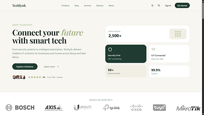 The website presents Techlynk’s full ecosystem including smart security systems, CCTV, IoT sensors, fleet tracking, smart home devices, installation services, maintenance, and consultancy. It features a clean, conversion-focused layout, mobile-first design, structured service pages, product catalog sections, partner brand showcase, live performance metrics, case study highlights, and lead generation flows.